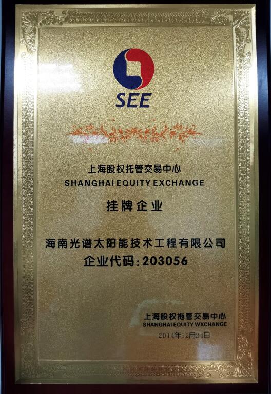 海南光譜節(jié)能環(huán)保科技有限公司成立于2001年,注冊(cè)資本1018萬元人民幣,是一家專業(yè)的太陽能、中央空調(diào)工程技術(shù)系統(tǒng)集成商。2014年12月24日,我司在上海股權(quán)托管交易中心成功掛牌,上股交代碼為:203056。