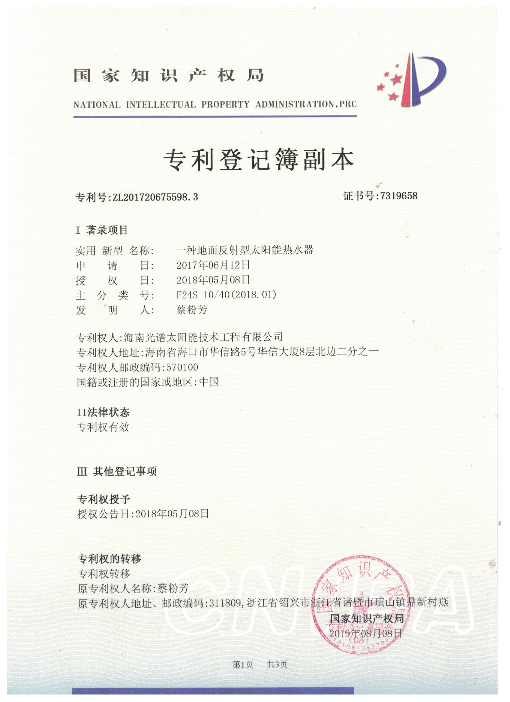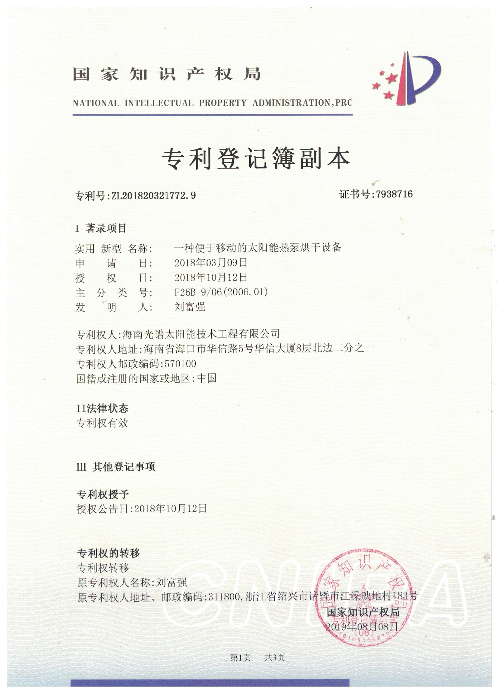 近日,我司申報(bào)的“一種太陽能熱泵蒸汽發(fā)生裝置”發(fā)明專利通過審查,獲得國家知識(shí)產(chǎn)權(quán)局授予的發(fā)明專利證書,授權(quán)專利號(hào)為“ZL201911126309.4”。 此次獲得國家頒發(fā)的專利證書,是對(duì)海南光譜公司創(chuàng)新實(shí)力的認(rèn)可,代表著我司知識(shí)產(chǎn)權(quán)取得了突破性進(jìn)展,為公司的持續(xù)性發(fā)展提供強(qiáng)有力的科技創(chuàng)...